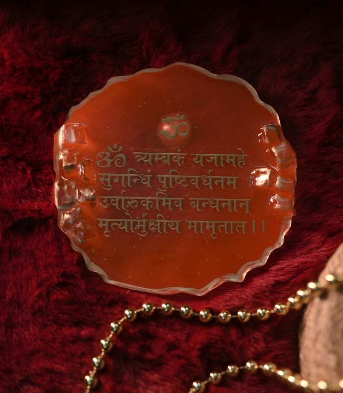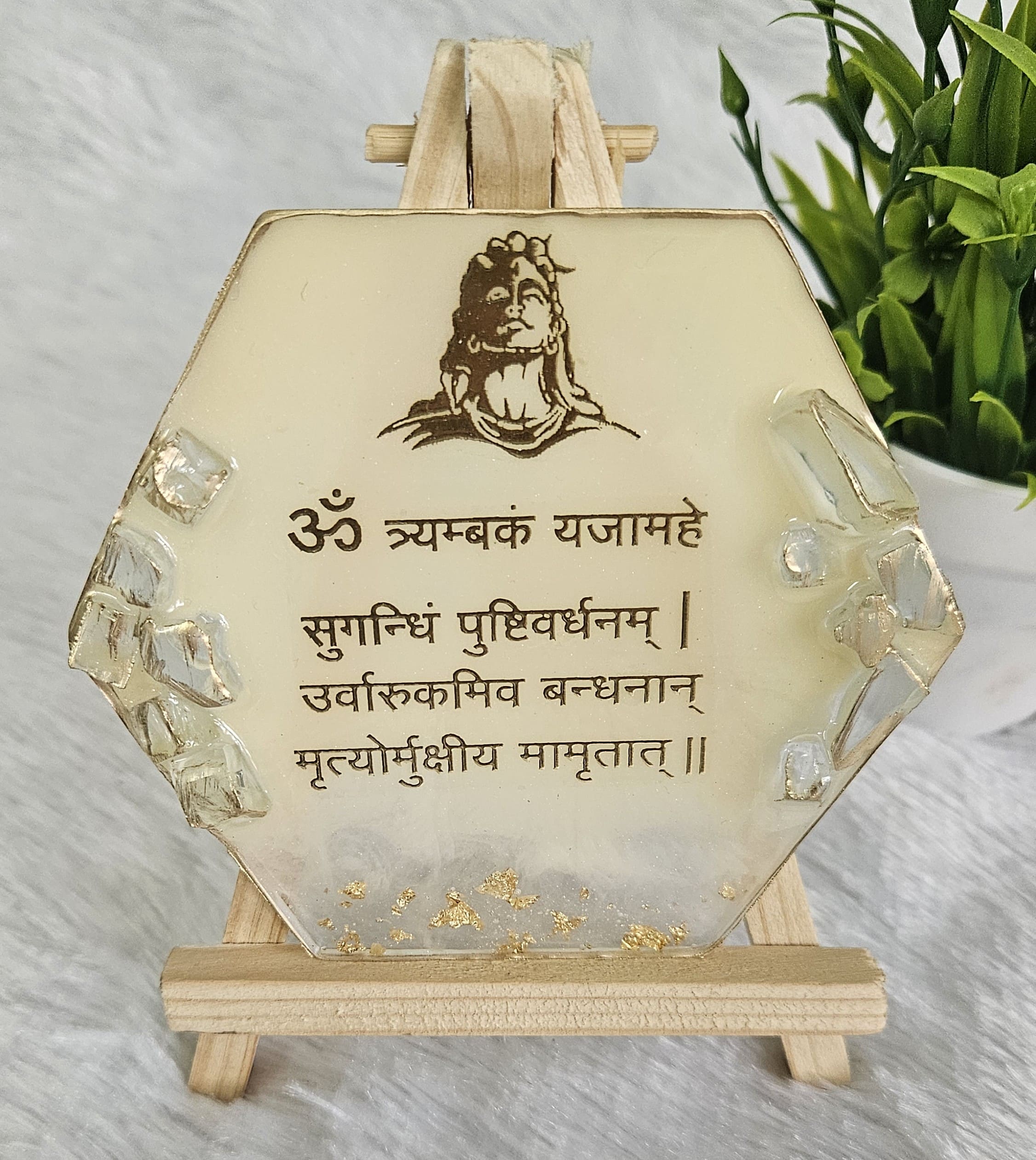 A divine blend of art and spirituality, this handcrafted resin mantra standee is designed in an elegant beige theme with a unique pentagon shape. The sides are adorned with sparkling glass crystals, adding a radiant charm to the piece. At its center, it features the powerful Adi Yogi Shiva symbol along with the sacred Mahamrityunjaya Mantra, invoking strength, healing, and protection.