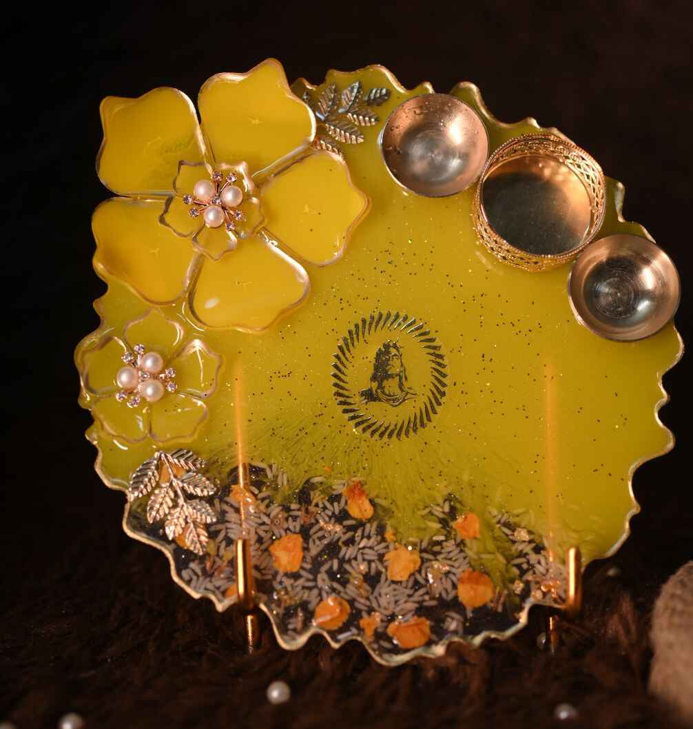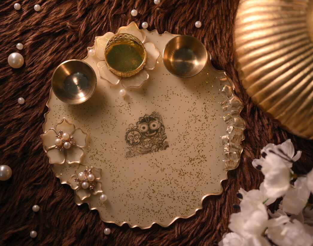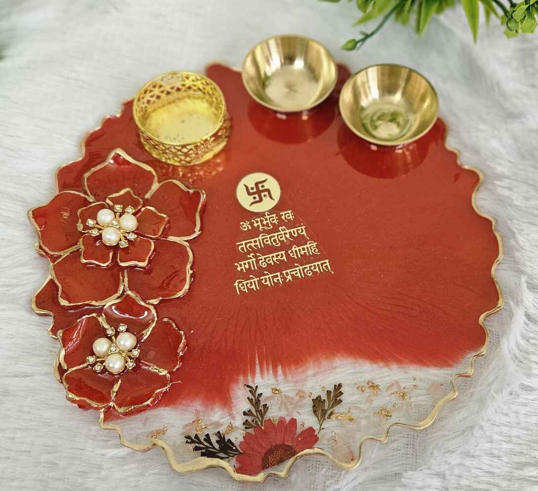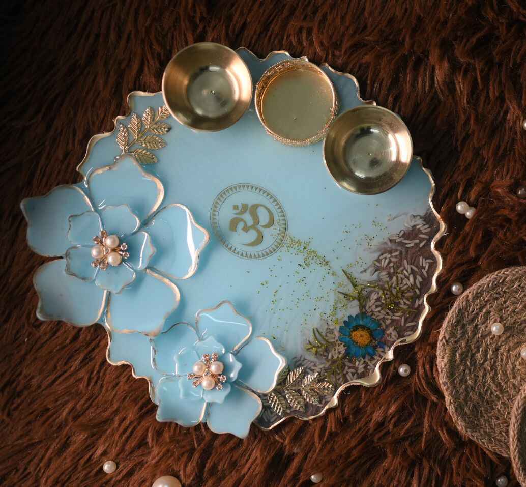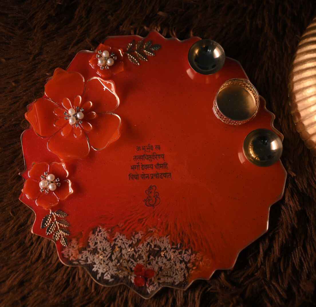 Add a touch of elegance to your sacred space with our handcrafted 8-inch Resin Pooja Plates, beautifully designed with 3D resin flowers for a stunning elevated effect. Each piece is uniquely crafted in different colours and floral patterns, making every plate a one-of-a-kind creation. Perfect for daily rituals, festive décor, or gifting, these plates blend artistry with devotion. Customization available to match your preferred colour, theme, or design.
