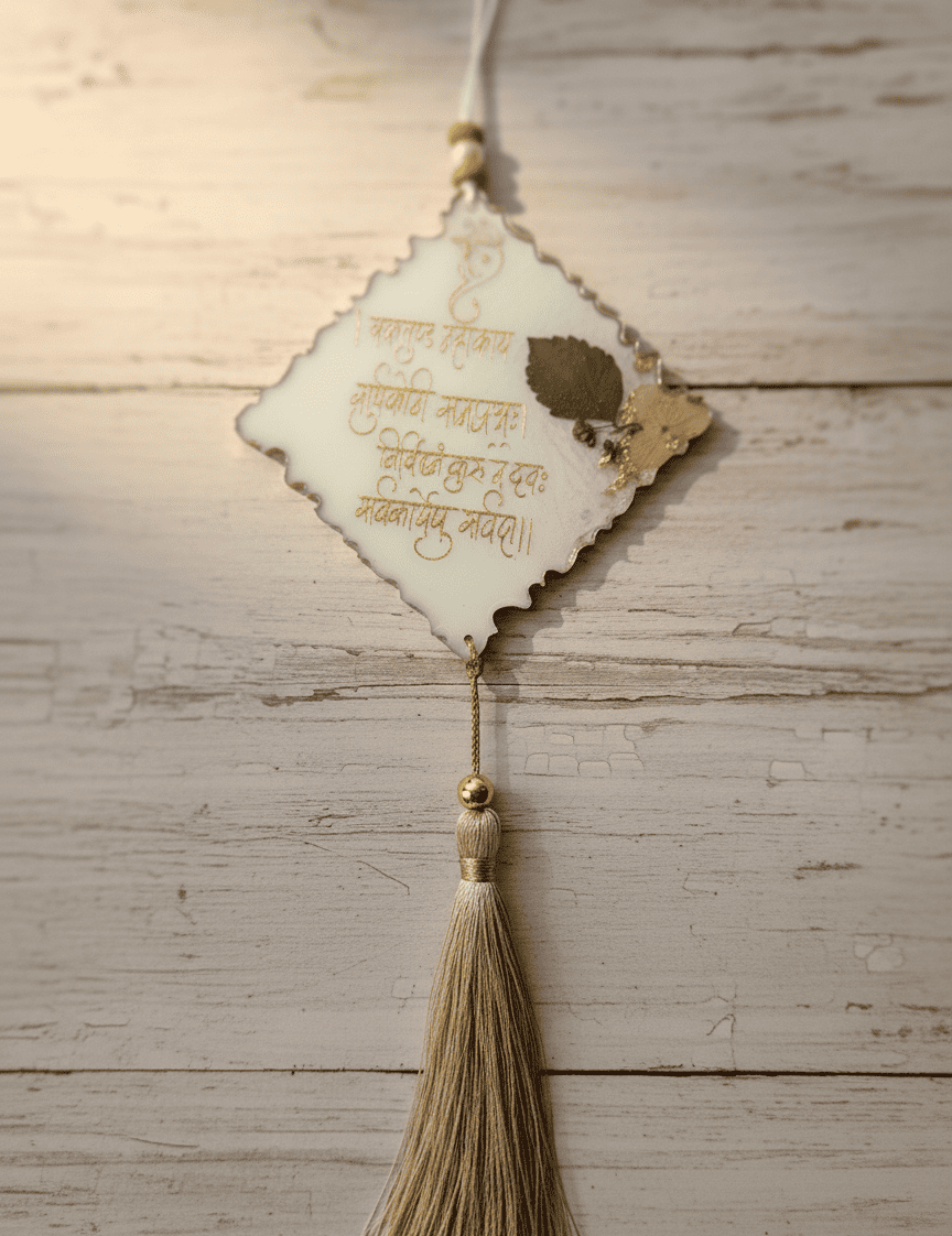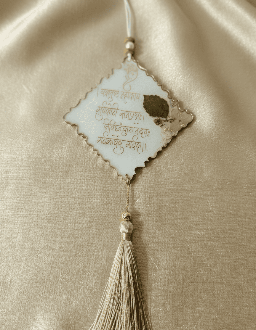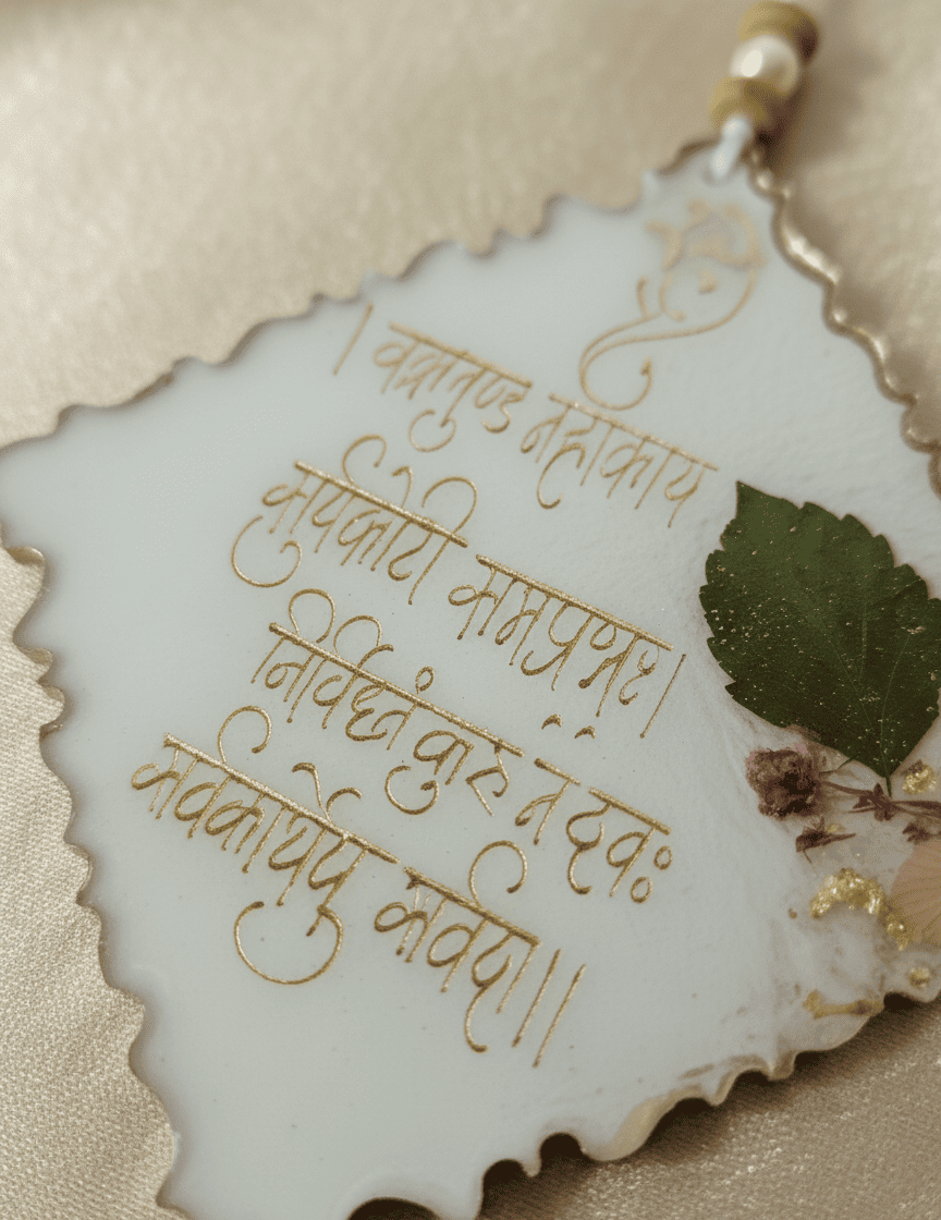 Elevate the ambiance of your home with this exquisite handcrafted wall hanging, featuring the powerful Vakratunda Mahakaya Ganesha mantra inscribed in elegant Sanskrit. This sacred charm is meticulously crafted from high-quality resin, adorned with delicate real botanicals (leaves and flower petals) and shimmering gold accents, adding a touch of natural beauty and spiritual grace.