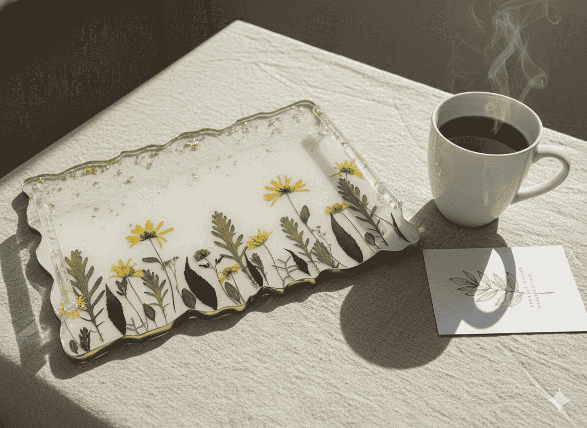 Bring the warmth and beauty of alpine flora into your home with the GoldenHorizon TraySet. This handcrafted white resin tray is adorned with real mountain leaves and vibrant yellow flowers, preserved under crystal- clear resin to showcase their natural charm. The tray is thoughtfully designed with resin handles for easy carrying and comes as a complete set with four 3.5-inch uneven square coasters, each a miniature botanical work of art.