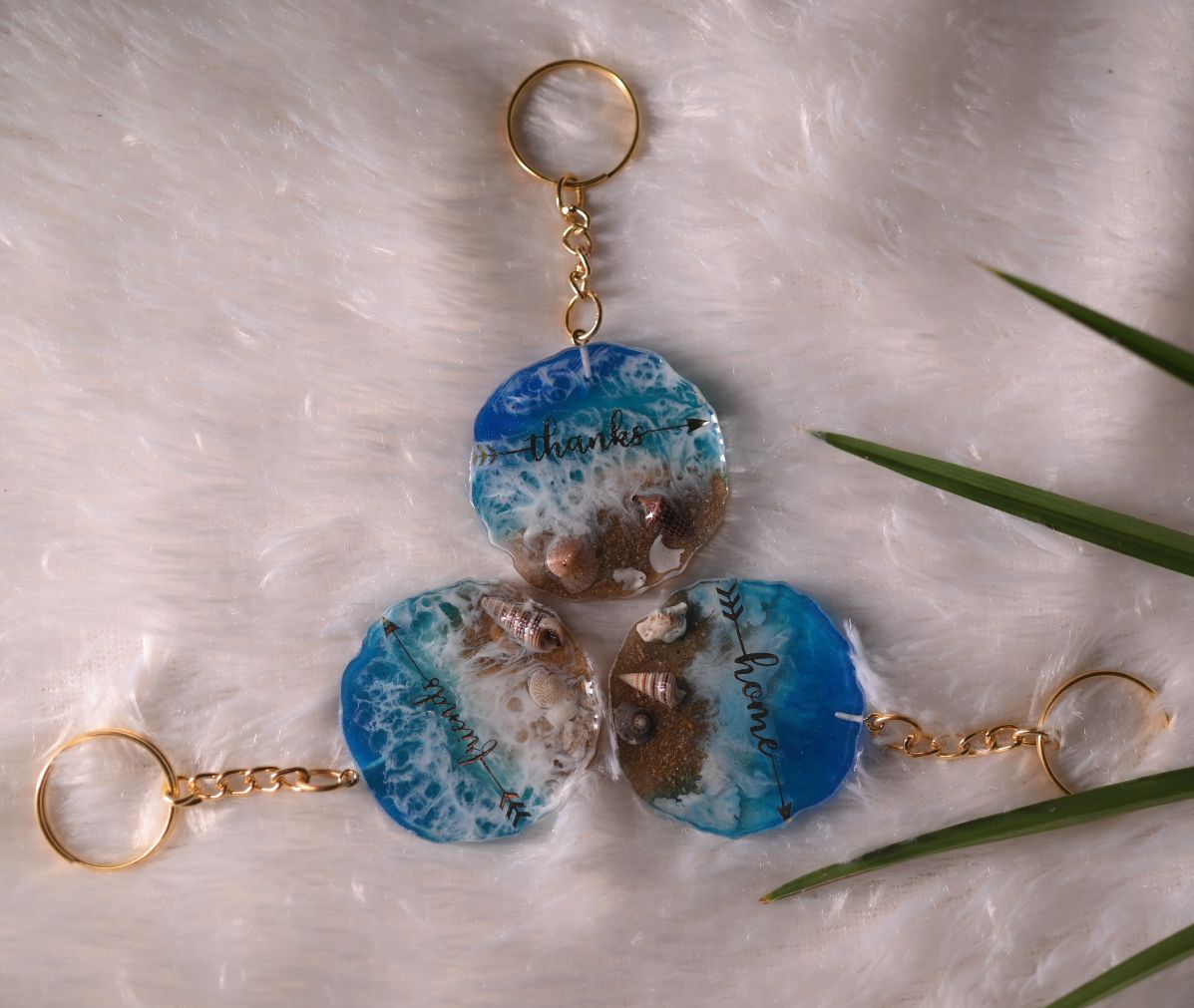 Perfect for personal use or as a thoughtful gift, the Ocean embrace keychains are more than just key holders — they are tokens of positivity, divinity, and the eternal rhythm of the Personalize your keys with the serenity of the sea through the Oceanora keychains. Each handcrafted resin keychain is created in an artistic uneven round shape and carefully designed to display your chosen initials in shimmering gold script. The piece carries the essence of the ocean with sands from Rameshwaram and handpicked shells from the Kanyakumari Sangam, accentuated with delicate waves and subtle golden highlights.
