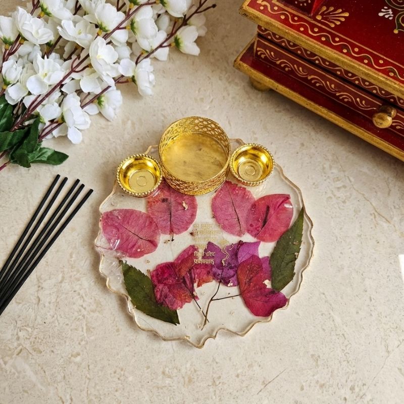 Elevate your spiritual rituals with this premium resin pooja plate, designed to bring elegance, devotion, and functionality to your sacred space. Each plate is adorned with delicate floral accents and rice, while the 2 golden katories and metal tealight holder provide convenience for daily pooja or special ceremonies. Its compact design makes it perfect for home altars, small pooja corners, or personal shrines,