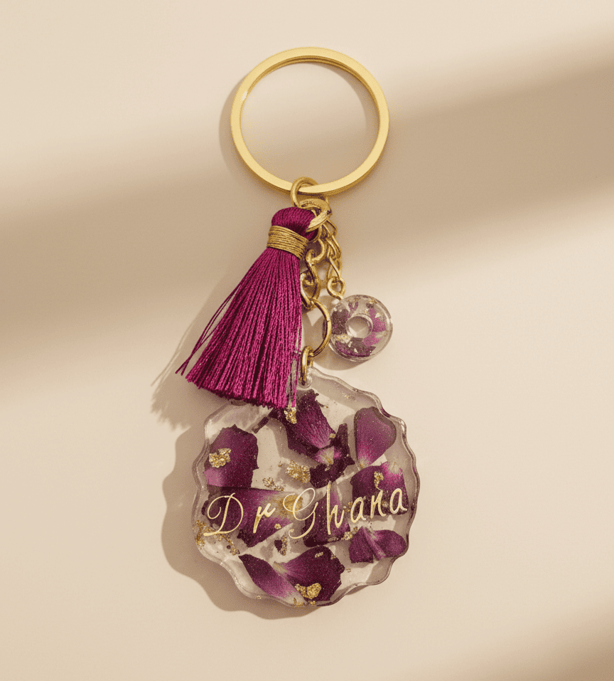 Beautifully handcrafted resin keychains featuring specially preserved real flowers — whether carefully selected or your own meaningful blooms. Each piece is unique, capturing nature’s delicate beauty in a timeless keepsake. Available with or without personalized name customization, these keychains make a thoughtful gift or a cherished way to carry someone’s special flowers with you every day