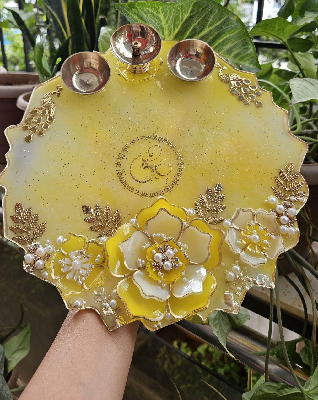 The swarna pushp thali is a luxurious handcrafted resin pooja plate that radiates divine elegance and timeless artistry. Crafted in a serene lemon-yellow base with subtle marble patterns, it features pure brass bowls for haldi, kumkum, and chawal, along with a pure brass diya, symbolizing light and purity.